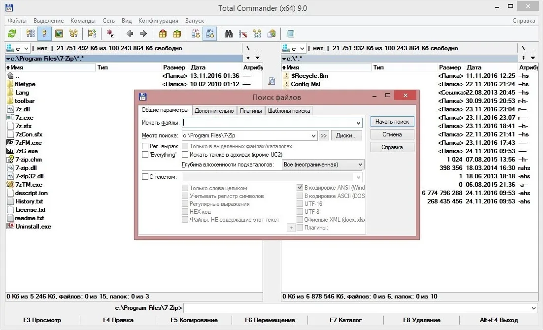 Total Commander поддерживает расширенный поиск объектов по заданным параметрам, позволяет находить дубликаты файлов и обнаруживать искомую информацию внутри документов любого типа, включая архивы. Обеспечивает взаимодействие с файлами большого объема, позволяет их разрезать, склеивать и просматривать при помощи встроенного инструмента lister.